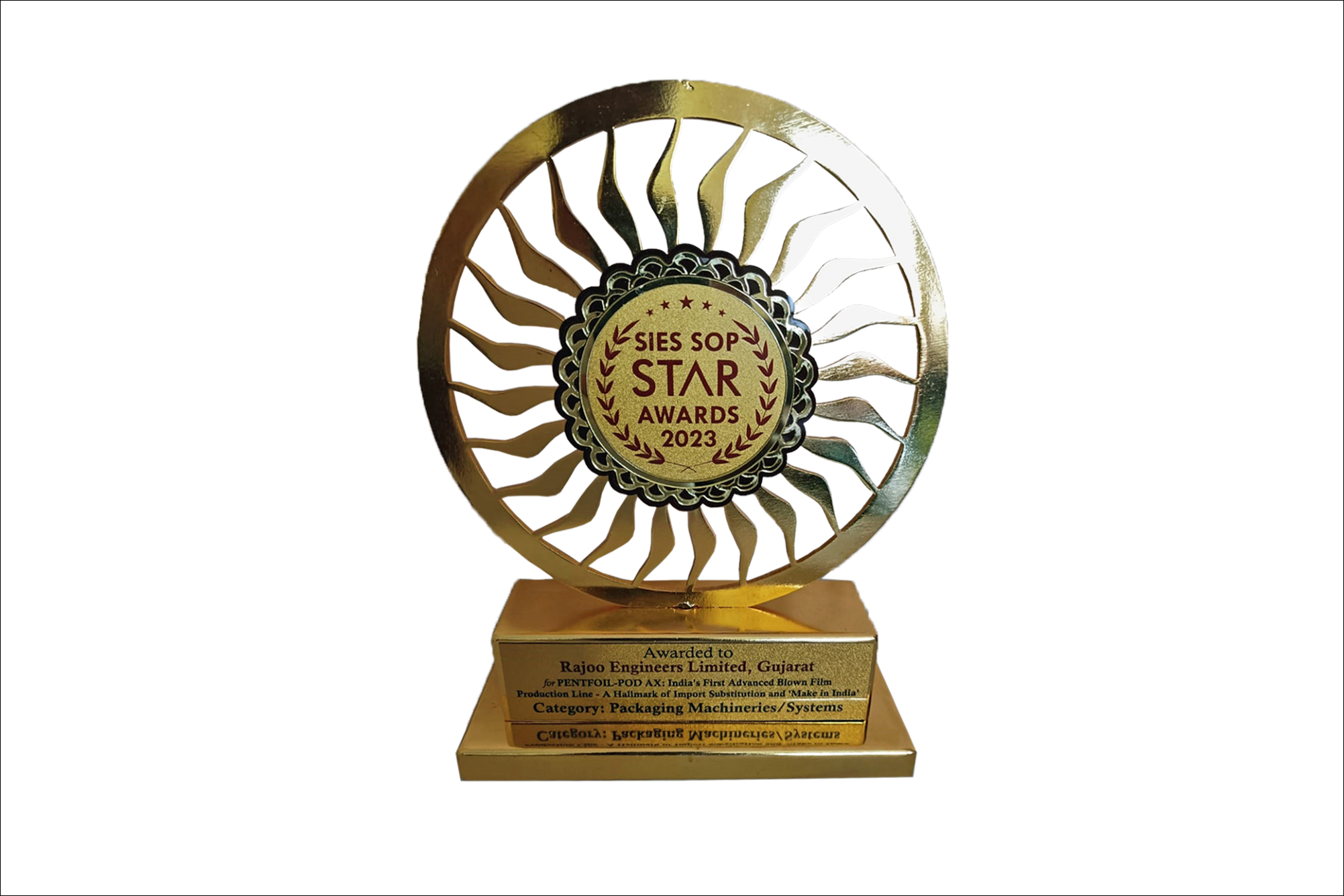 Rajoo Engineers Ltd, a pioneering force in the field of plastic processing machinery, has been recognized with the prestigious SIES SOP STAR 2023 Award for their groundbreaking innovation, the PENTAFOIL-POD-AX, the five layer (POD) blown film line for flexible packaging. The award from South India Education Society School of Packaging, Mumbai (SIES- SOP), presented in acknowledgment of excellence in import substitution and ‘Make in India’ initiatives, highlights the transformative impact of Rajoo’s indigenous technological advancements.